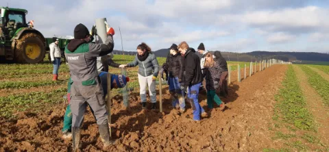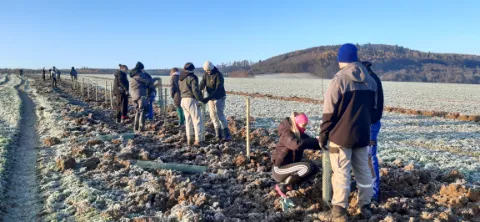 Ve středu 19. listopadu 2025 jsme vypomohli zemědělské společnosti Drnovice a.s. s výsadbou 660 stromků. Na poli nad Pístovickým rybníkem jsme v mrazivém ránu začali s výsadbou javorů, topolů, jabloní, švestek a hrušní. 3 pásy – v každém 220 stromků.