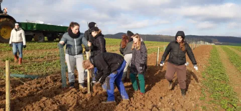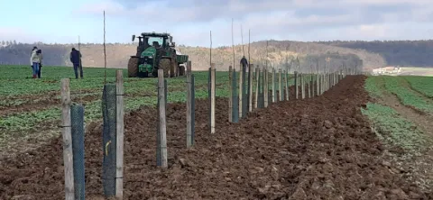 Změřili jsme vzdálenost, vyvrtala se jáma, zatloukl opěrný kůl a zasadil stromek. Zahrnuli jsme hlínou, kmen obalili pletivem proti okusu zvěří a přichytli ke kůlu. 660 zasazených stromků za jeden den je úctyhodný výkon.