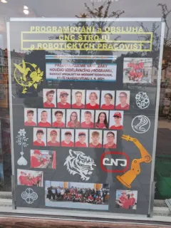Vystavené tablo s portréty žáků zmíněného tříletého studijního programu si můžete prohlédnout na vyškovském náměstí ve výloze obchodu s knihami, hned vedle budovy Komerční banky. Poděkování za umožnění prezentace patří majiteli obchodu p. Žurkovi, který žáky Programování a obsluhy CNC strojů a robotických pracovišť dlouhodobě podporuje.