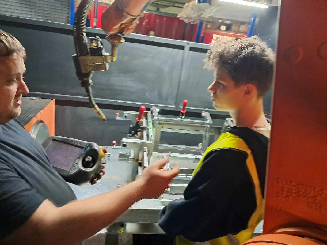 Dne 16. dubna 2026 absolvovali žáci 3. ročníku zaměření „Programování a obsluha CNC strojů a robotických pracovišť“ (obor Obráběč kovů) další důležitou etapu jejich odborné přípravy. V Rousínově pod vedením zkušených odborníků z firmy European Data Industries s. r. o. p. Zbyňka ILČÍKA, p. Ing. Jaroslava PODSEDNÍKA a p. Daniela VEČERKY se žáci prakticky seznámili s programováním a specifiky začlenění průmyslových robotů do moderní sériové výroby.